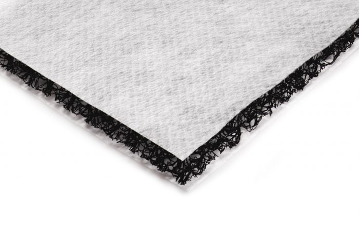 Drainage geocomposite made by a 3-dimensional, high void ratio monofilaments core heat bonded with two filter geotextiles.